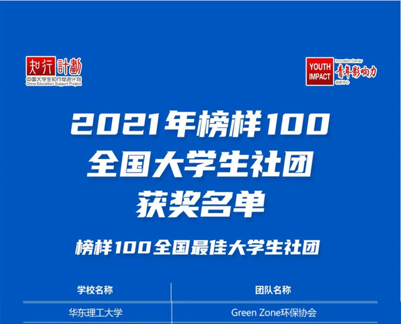 2022年1月,为积极响应“美丽中国 青春行动”号召,鼓励和支持青年大学生成为美丽中国的践行者,由共青团中央发起,2021年知行计划“榜样100”全国最佳大学生社团评选活动落下帷幕,bat365在线平台官方GreenZone环保协会(挂靠指导单位:bat365在线官网登录入口)已连续三年被评为“榜样100”全国最佳大学生社团。