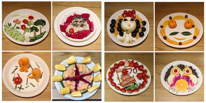 在创意拼盘制作过程中,各路选手创意奇出,奥利奥搭配酸奶化身“繁星闪烁的夜空”,用黄瓜和苹果生动展现出“接天莲叶无穷碧,映日荷花别样红”,火龙果、奥利奥与面包制成的蜡笔小新造型让人眼前一亮,更有选手借拼盘表达对新中国成立70周年的祝福。