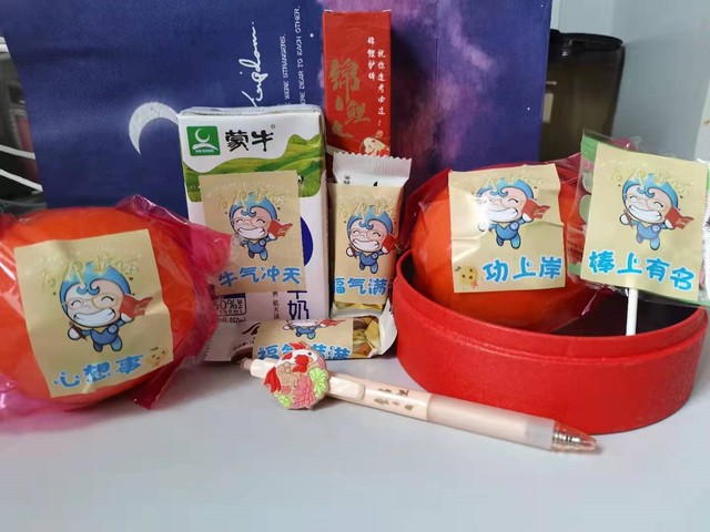 12月8日中午,学院党委副书记曹娜、毕业班辅导员王青、教务员梁晓媛以及学生骨干一起将120份“暖心加油包”送到考研学子手中,用特别的方式为即将踏上“战场”的考研学子加油助威。这份“暖心加油包”爱心浓浓,寓意美好,包括“牛气冲天”牛奶、“金榜题名”棒棒糖、“福气满满”德芙、“成功上岸”橙子以及“逢考必过”锦鲤盲盒等。